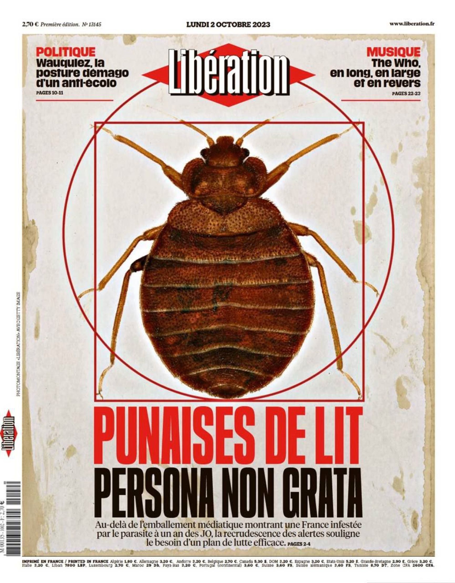 В начале октября в сети стали появляться сообщения о том, что во Франции настолько распространились постельные клопы, что это обеспокоило правительство и оно уже начало разрабатывать программы борьбы с ними. А причина нашествия клопов — украинские беженцы, которые привезли насекомых в своих вещах. Эти сообщения часто были проиллюстрированы скриншотом из газеты Libération, где виден заголовок: «Постельные клопы — persona non grata».