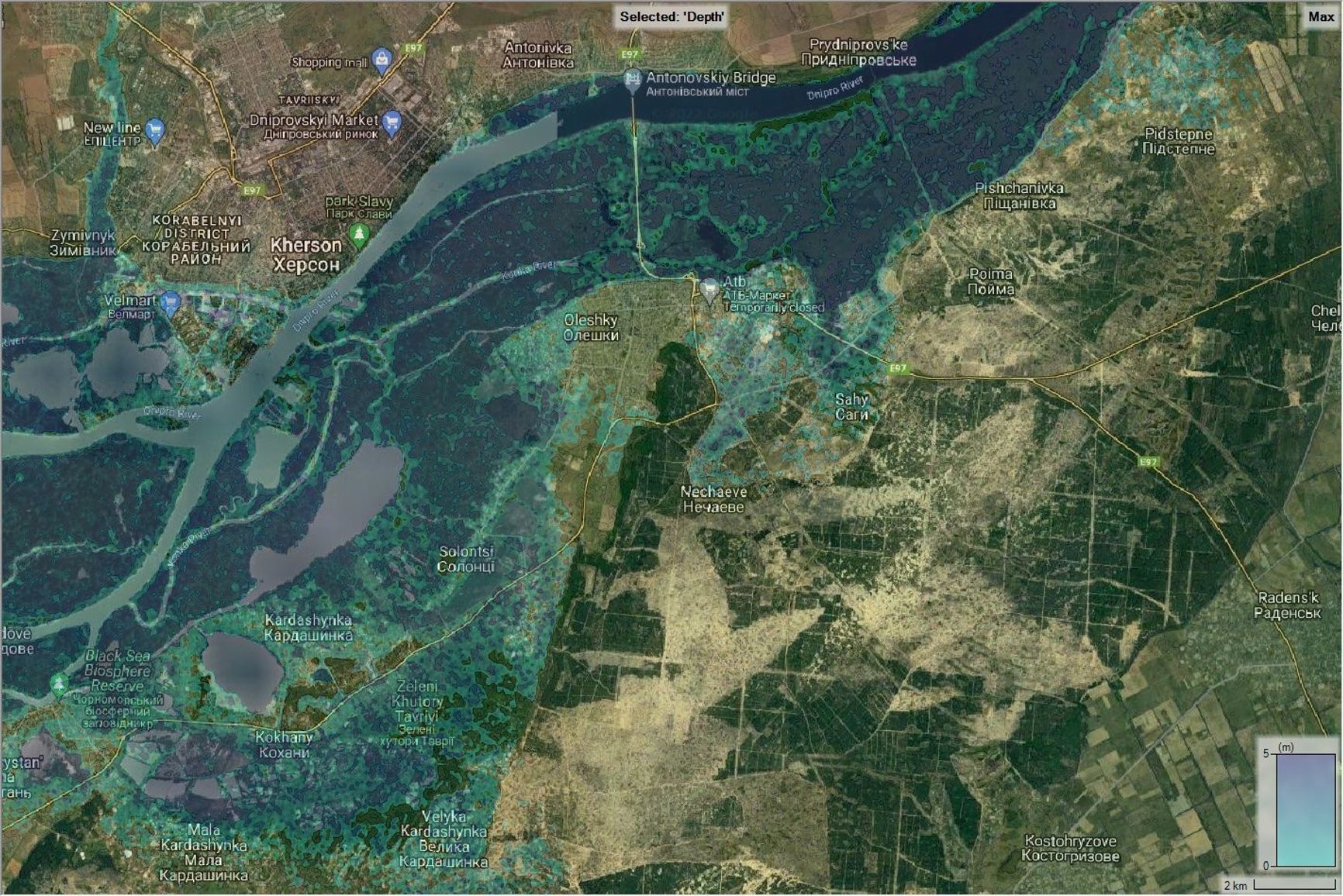 Modeling of the worst case scenario of the Nova Kakhovka Dam forecasted that in 19 hours, a wave up to 4-5 meters will fall on the Antonivka bridge east of Kherson, washing out the Ingulets river. Flooding will carry on furhter along the Bug river, reaching Mykolayiv in 4 to 5 days.