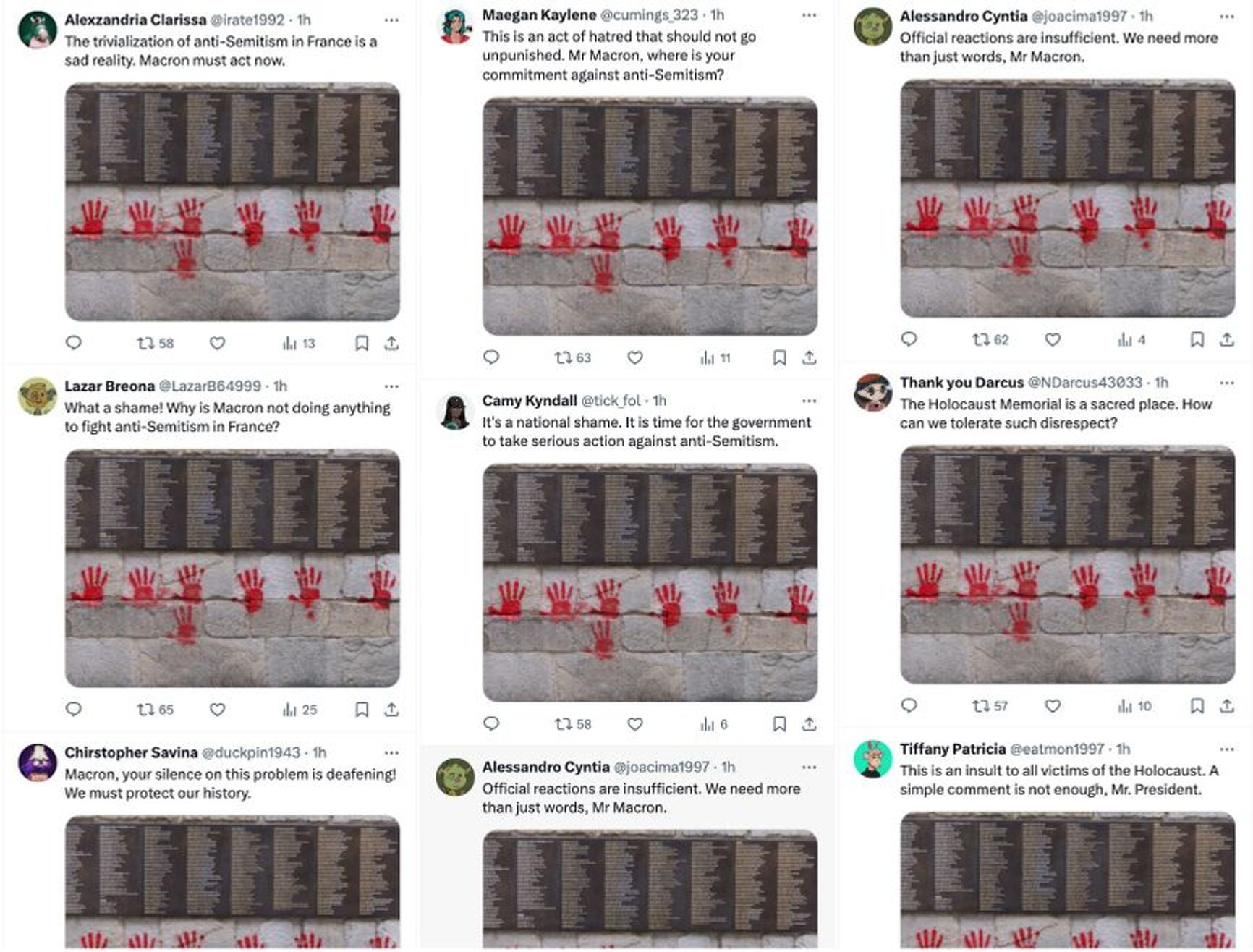 A day and a half after the Wall of the Righteous graffiti appeared, the Kremlin's Doppelgänger bot network began circulating photos of the palms on Twitter, accompanied by claims about how Emmanuel Macron was doing nothing about the apparently rising levels of anti-Semitism in his country. They were later deleted, but archived copies survived (1, 2, 3). This fact was noticed by the Bot Blocker project, which monitors the Doppelgänger network’s activities online.