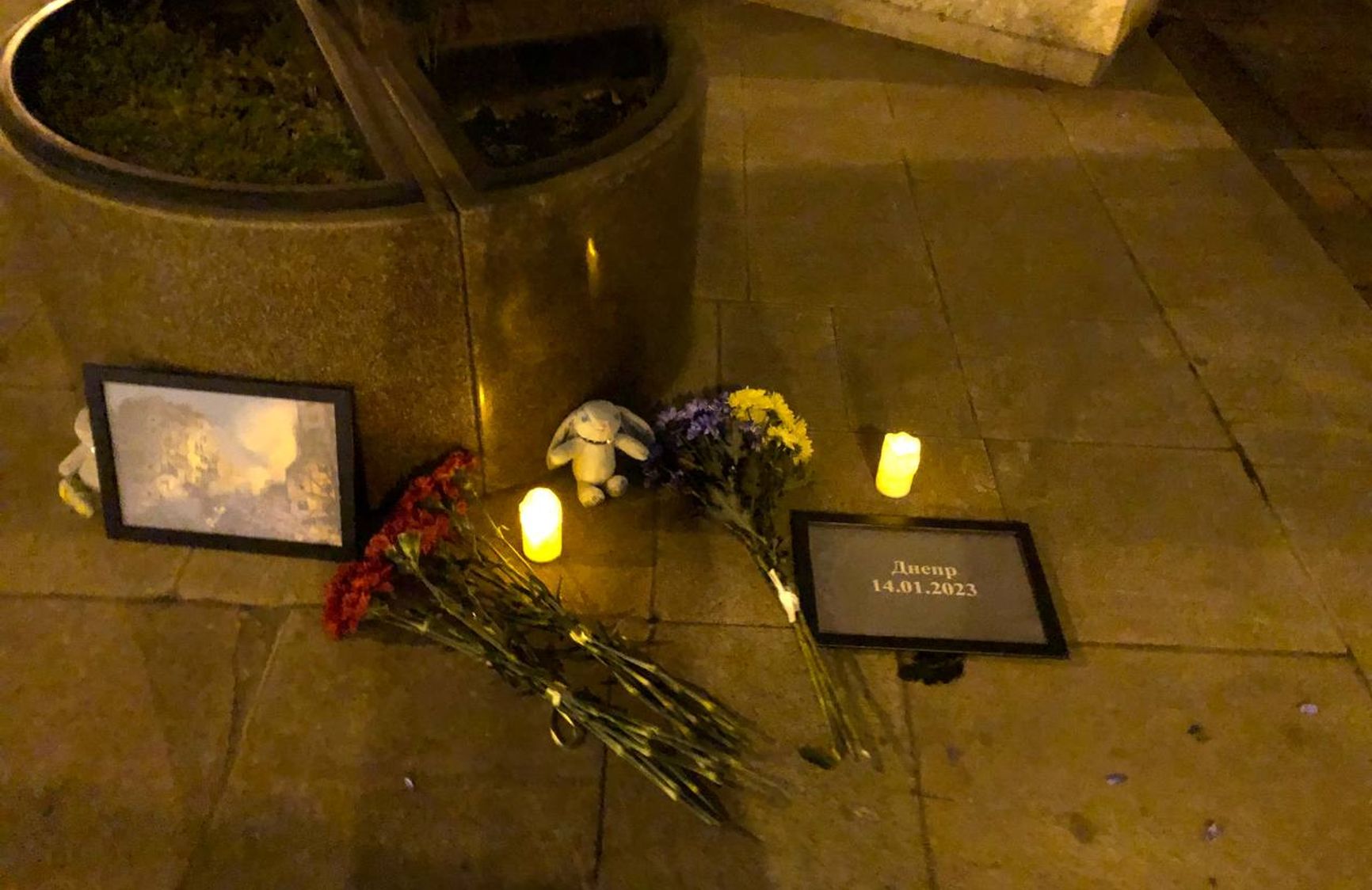 На снимках с места видно, что у памятника положили также фотографию разрушенного ракетой дома и табличку с надписью «Днепр 14.01.2023».
