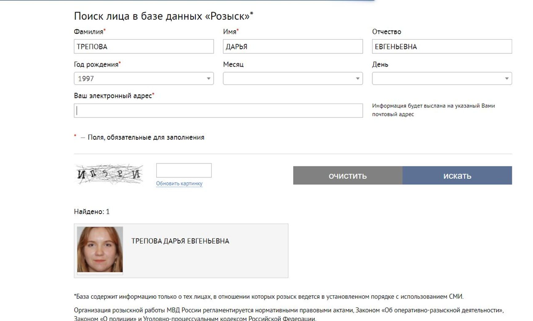 Позже СМИ обратили внимание, что МВД объявило Трепову в розыск. Девушку разыскивают по уголовной статье, уточняется в базе: