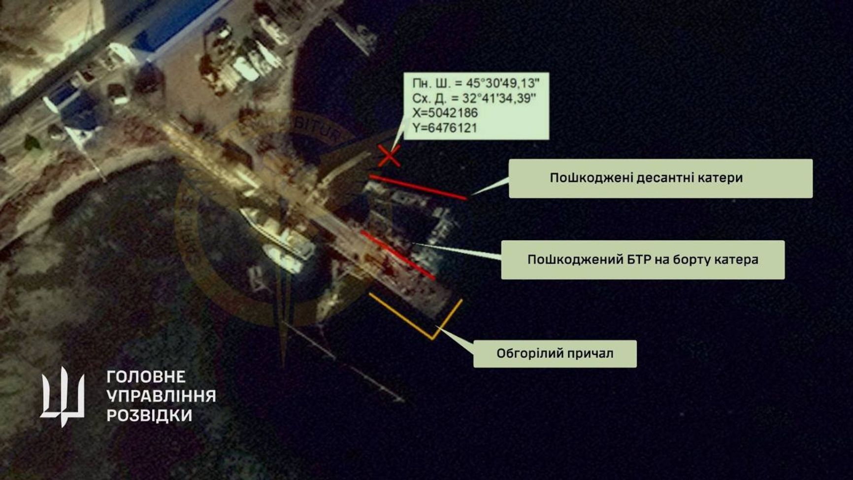 Позднее в ГУР опубликовало спутниковый снимок, который, как сообщается, свидетельствует, что оба катера пошли на дно, причем на борту одного из них действительно был БТР. В украинской военной разведке уточнили, что «Акула» затонула сразу, а «Серна» еще поборолась за живучесть, но безуспешно.
