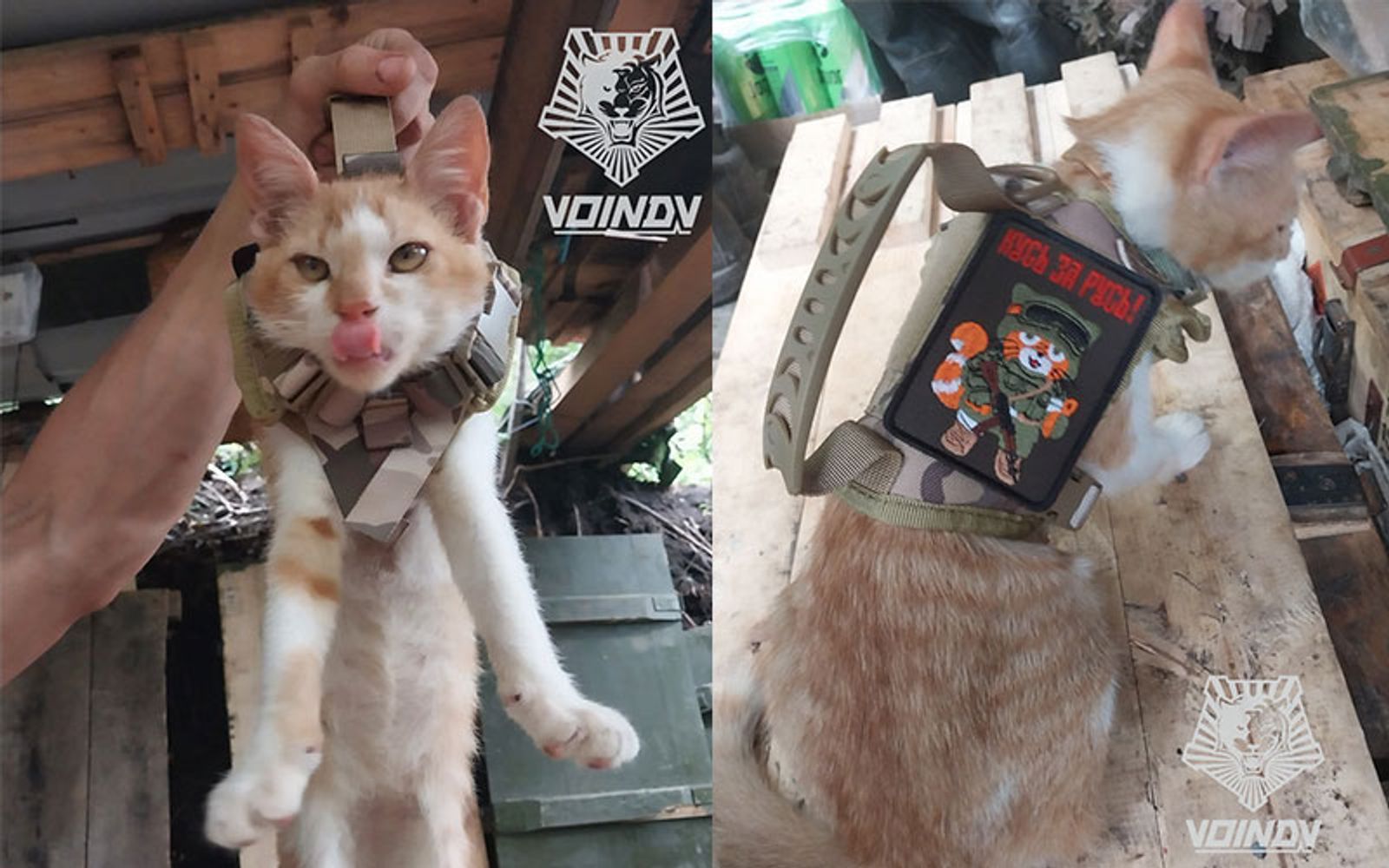 Российские военнослужащие представили инновационный способ противодействия мышам под названием КНШ-1 (кот носимый, шерстяной). В Z-канале «Воин DV» опубликовали фотографии кота со шлейкой для переноски животного. На шлейке заметен шеврон «кусь за Русь».