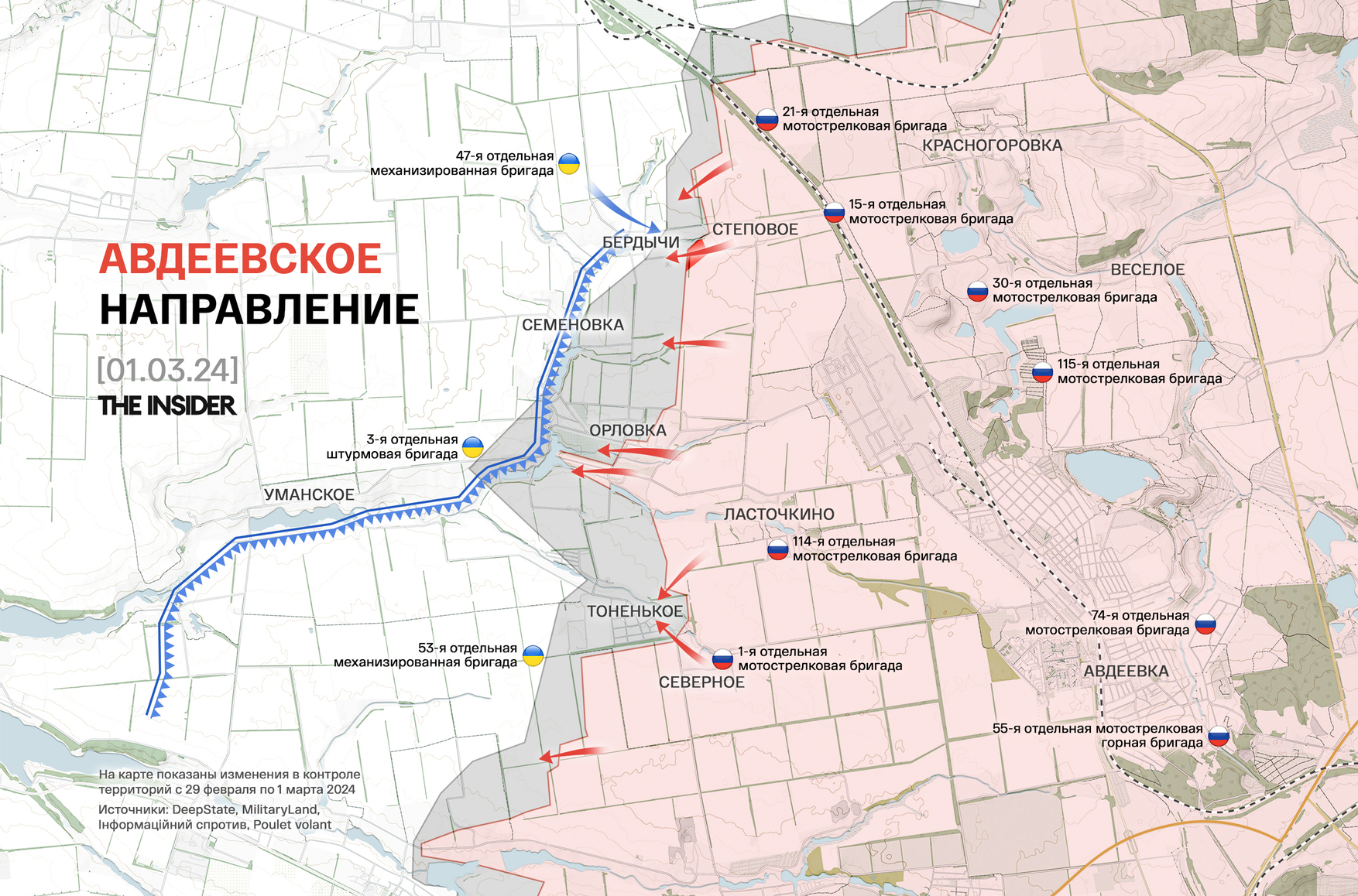 По подсчетам ресурса Poulet volant, с 31 января по 29 февраля 2024 года части ВС РФ заняли 139 км², из них 129 км² — в Донецкой области.