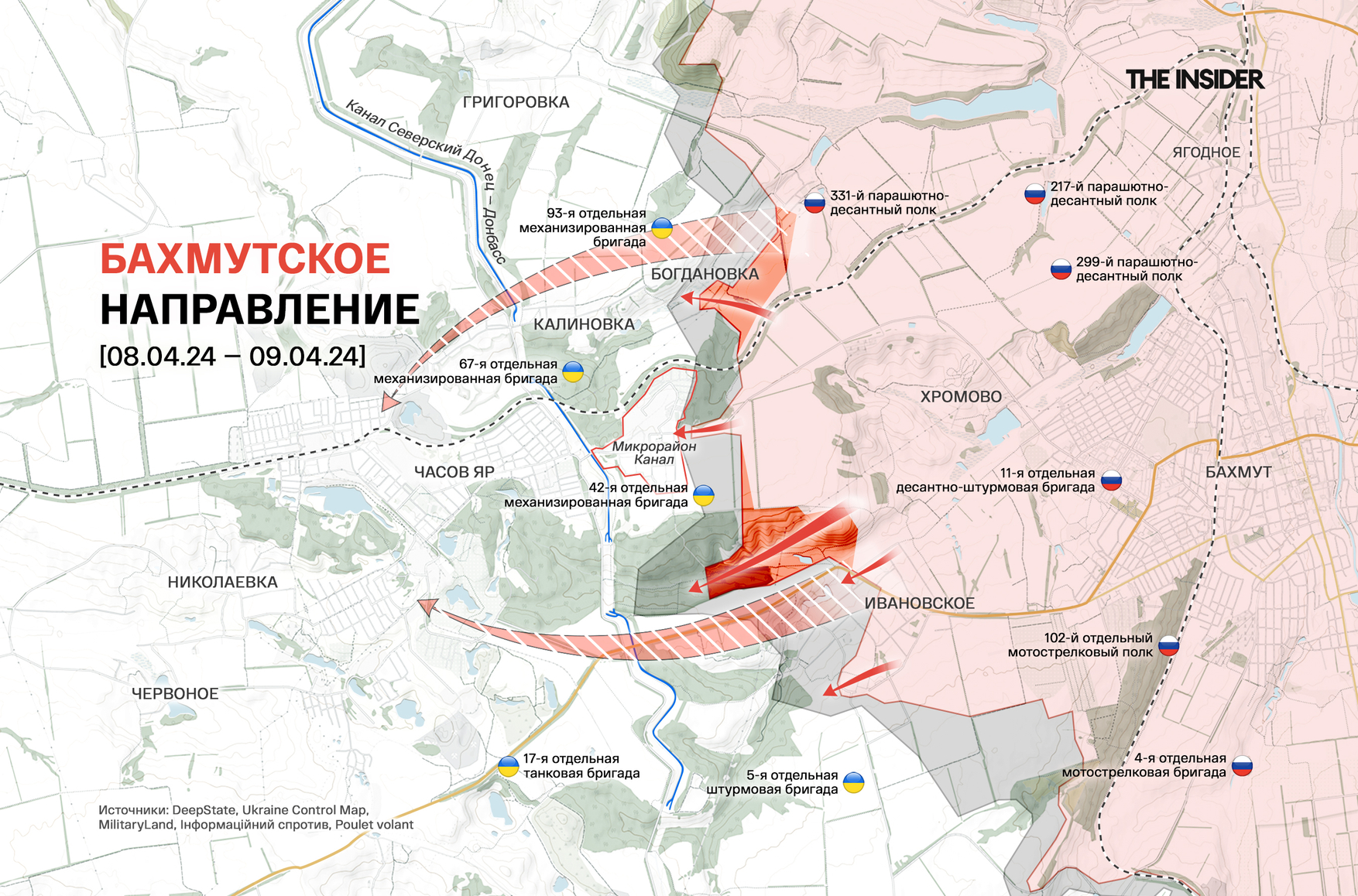 Российская 98-я гвардейская воздушно-десантная дивизия (в ее составе числятся 217-й, 299-й и 331-й парашютно-десантные полки) сообщает о продвижении в лесном массиве восточнее Часова Яра и южнее городского микрорайона «Канал».