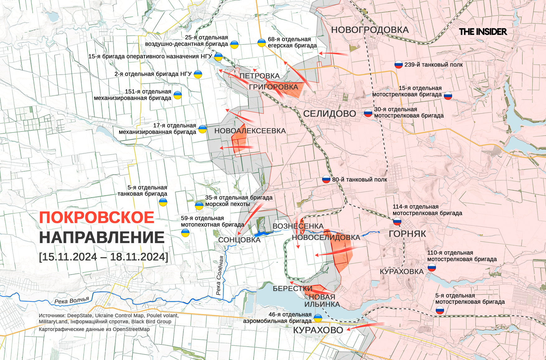 - 17 ноября — о восстановлении позиций ВСУ в Макаровке на Времевском выступе и захвате ВС РФ Григоровки (до 2016 года — Ленинское) на покровском направлении. Отмечалось продвижение российских военных возле Новой Ильинки и Берестков на северном берегу Кураховского водохранилища, а также в Дальнем южнее Курахова