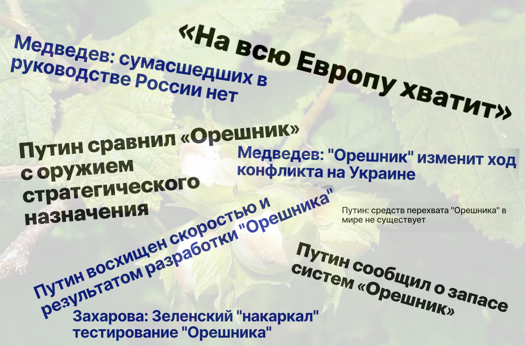 Путин второй день продолжает говорить об «Орешнике» — одной из «новейших», по его словам, российских ракетных систем средней дальности с баллистической ракетой в «безъядерном гиперзвуковом оснащении». Эксперты сразу обратили внимание на то, что никакого «гиперзвукового оснащения» у ракет не бывает - они либо являются таковыми, либо не являются. «Орешник» такой ракетой не является, так как не способен маневрировать на гиперзвуковой скорости, а значит является обычной баллистической ракетой. Путин также заявил, что «запасы “Орешника” у России уже имеются», и разрабатывали его якобы с 2023 года. По его словам, эффект от массированного применения «Орешника» «будет сопоставим с эффектом от оружия стратегического назначения». В действительности же эта ракета не является ни новой разработкой (это модификация старой ракеты), ни подходящим для массированного применения вооружением (слишком дорогая и неточная), пояснил The Insider военный обозреватель Сергей Ауслендер.