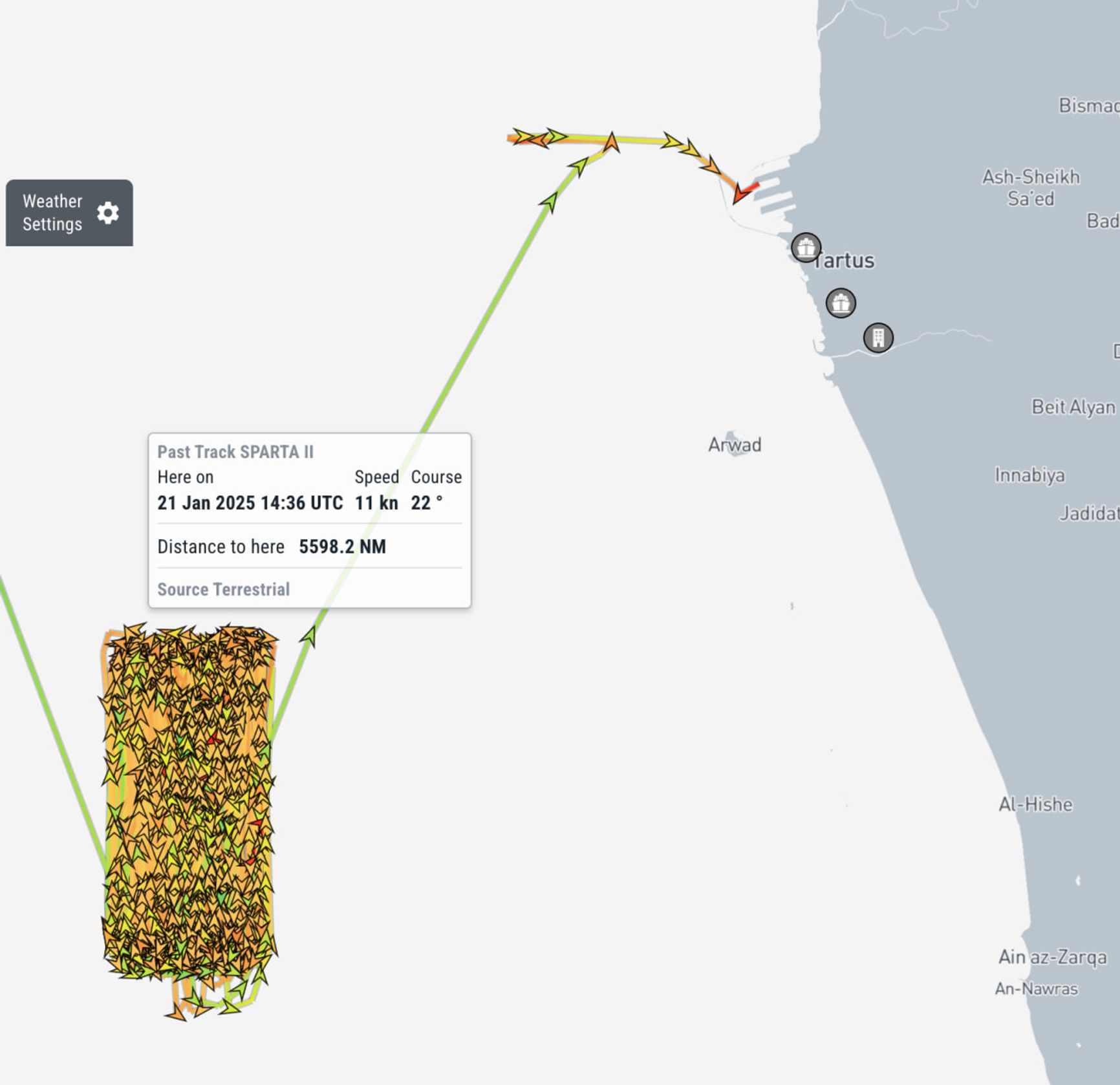 С 5 по 8 января ролкер «Спарта II» «кружил» в пяти морских милях (9,2 км) от тартусского порта. 8 января появились сообщения о том, что новые сирийские власти начали патрулировать акваторию. Одновременно с этим «Спарта II» отошла уже на расстояние 15,6 миль (29 км), то есть сразу за 12-мильную зону (около 22 км) территориальных вод Сирии. Позже он снова переместился поближе к берегу.