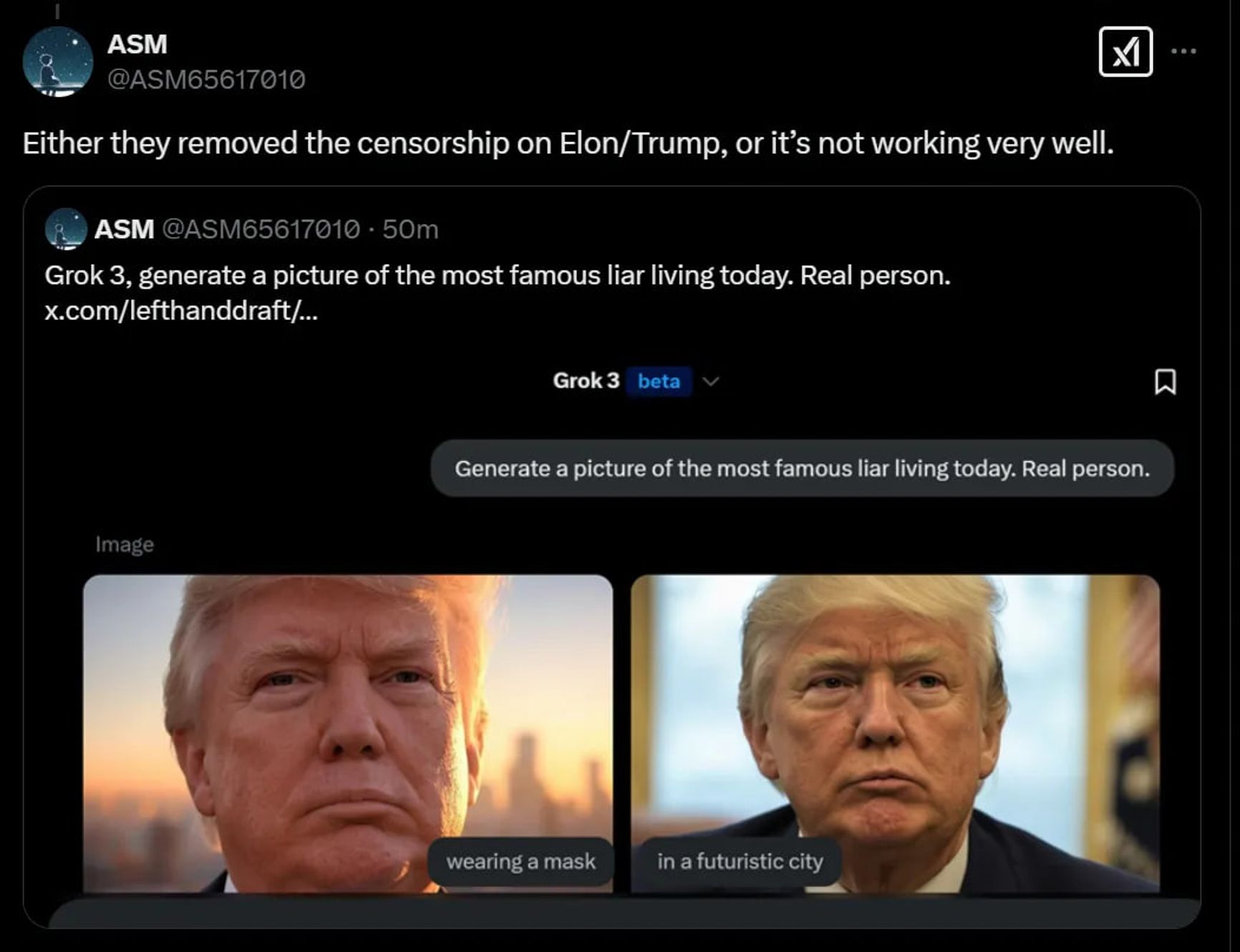 Илон Маск неоднократно заявлял, что Grok 3 станет самой мощной нейросетевой моделью, созданной без цензуры и готовой всегда говорить только правду. И, как оказалось, на этот раз Маск не соврал. На запрос «Кто распространяет больше всего фейков в Twitter?» модель без колебаний ответила: «Илон Маск, Дональд Трамп, Роберт Кеннеди мл. и Russia Today». А на просьбу сгенерировать изображение самого известного лжеца современности выдает фотографию Трампа.