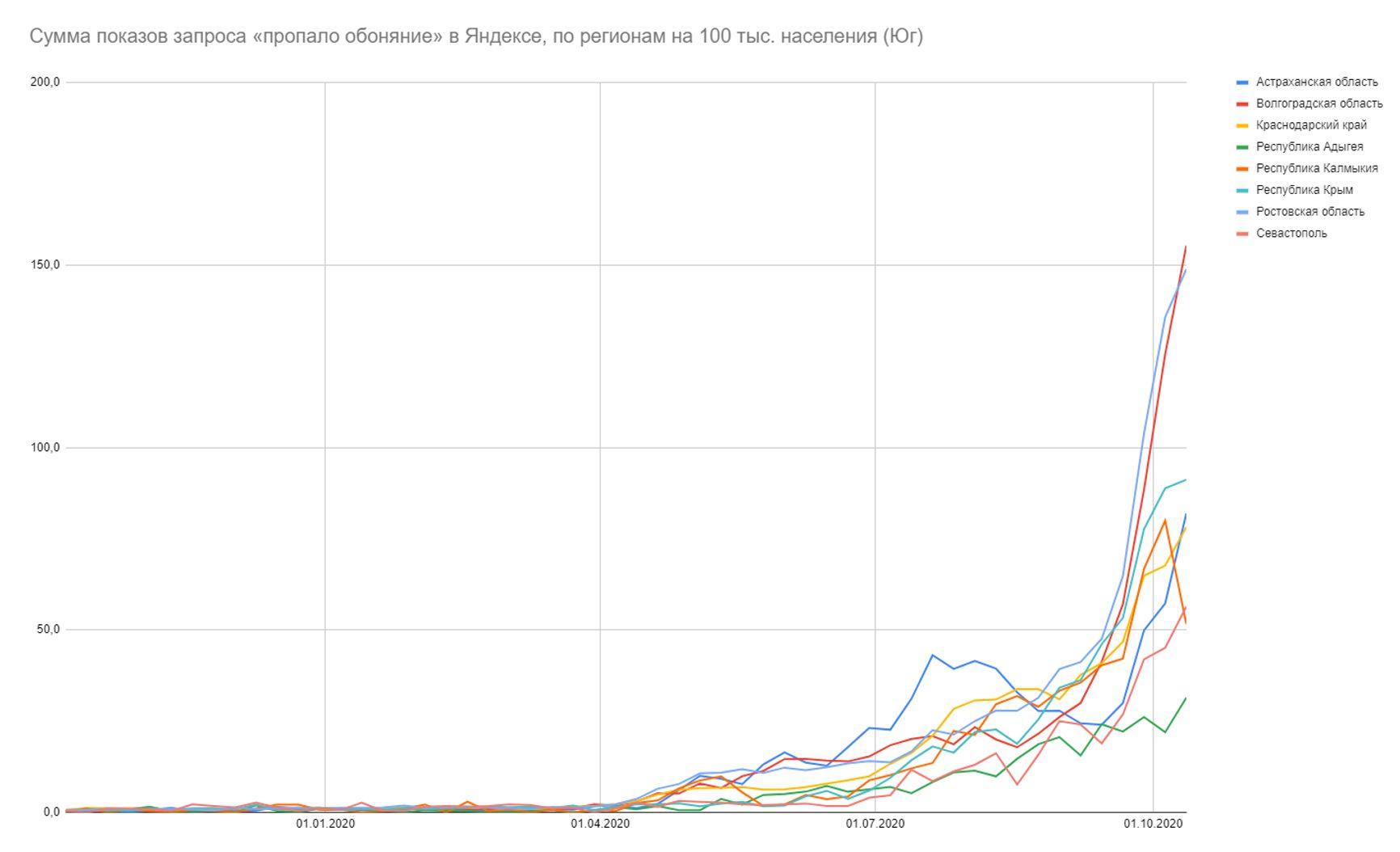Схожая ситуация в Ростовской области — рекордсмене по количеству и доле запросов. В остальных регионах ситуация спокойнее (но относительное число показов везде сопоставимо с Москвой на её пике). Во всех южных регионах, кроме Астраханской области, происходит замедление роста — если тренд продолжится, через 2−3 недели юг выйдет на плато.