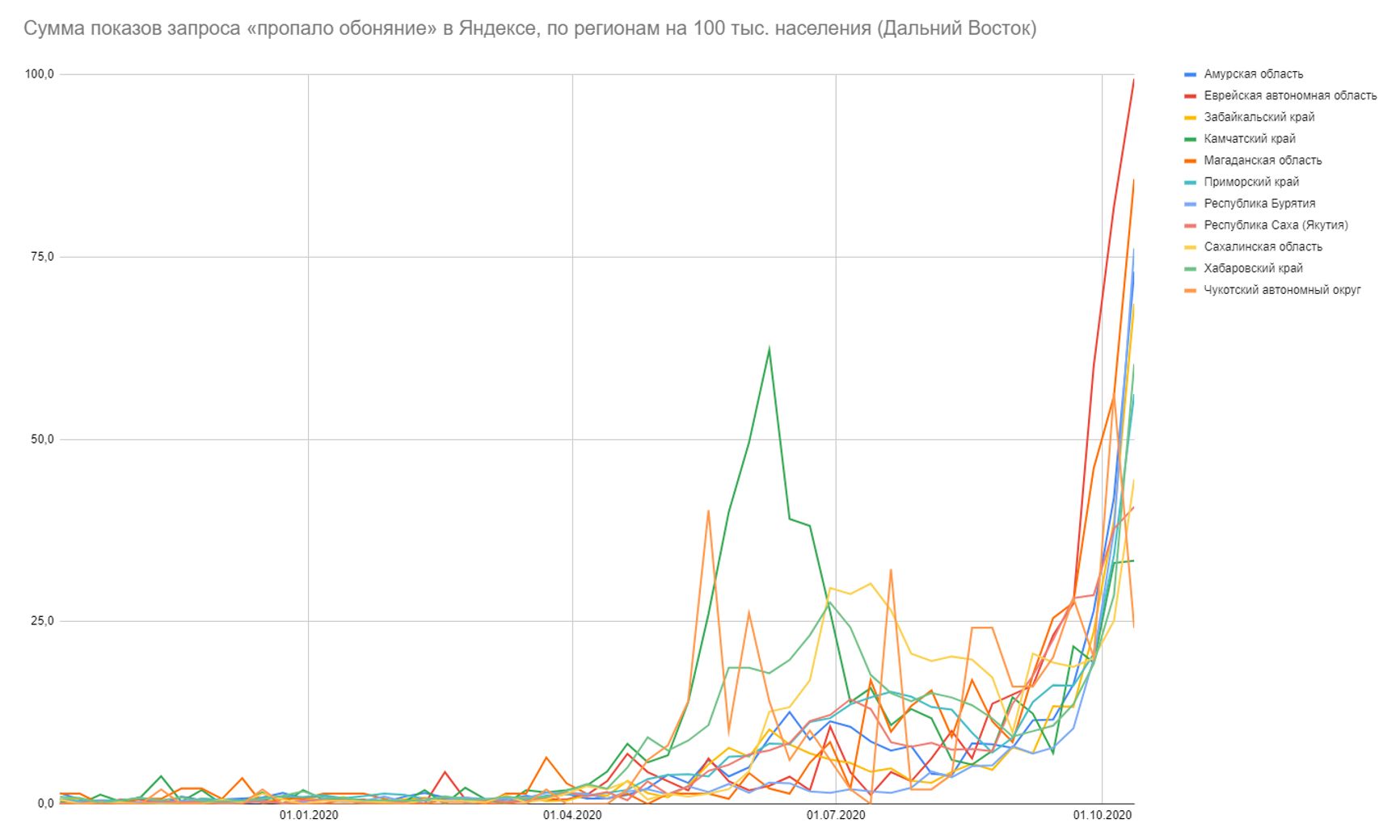 На Северном Кавказе — тише всего (в основном за счёт трёх регионов, где заболеваемость, как и запросы, на нуле). Северо-Запад и Дальний Восток начали расти — и тревожнее всего выглядят дальневосточные регионы, которые обошлись без полноценной первой волны. За единственным исключением: это Камчатка.