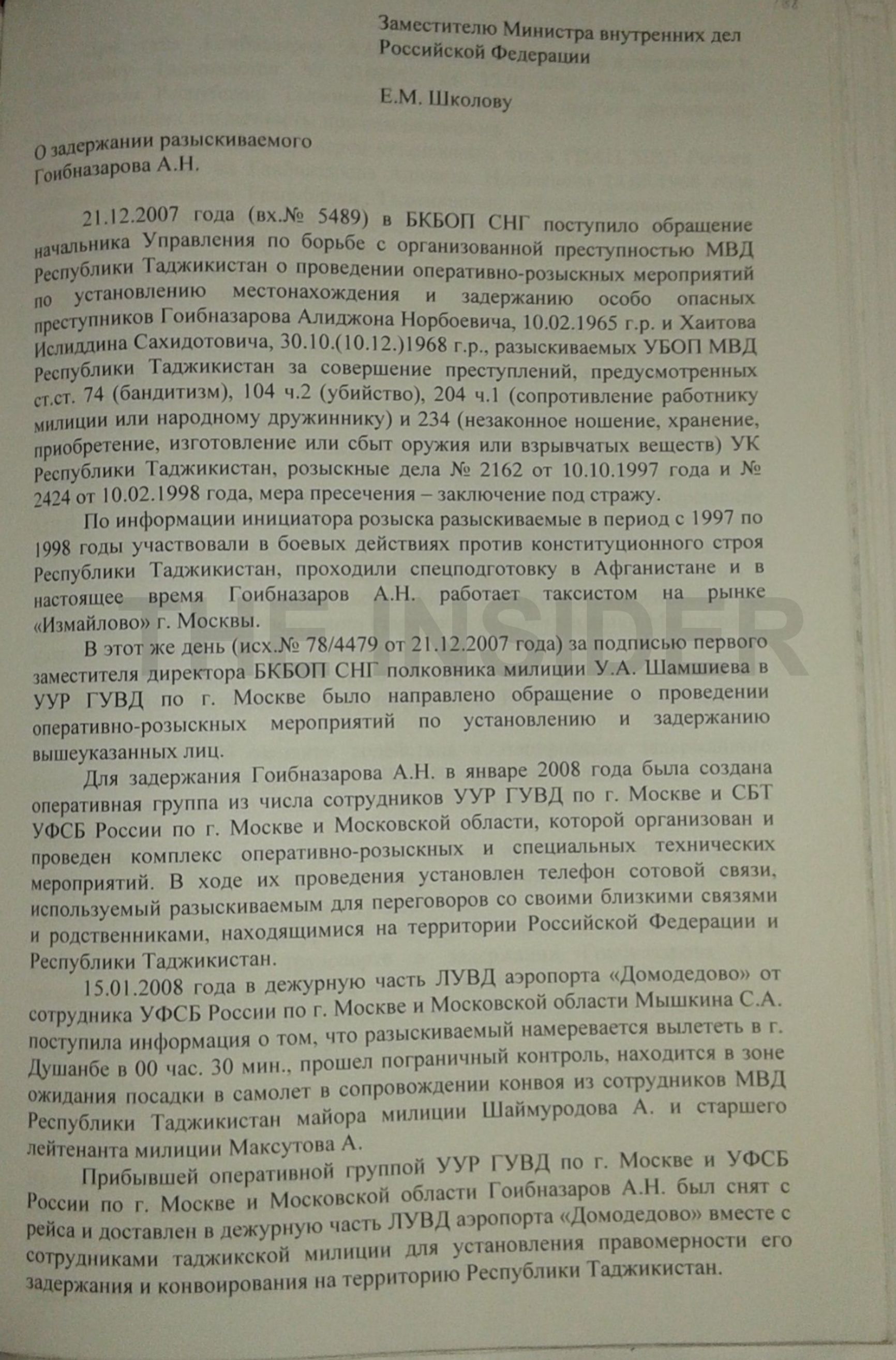 15 января 2008 года в Москве неизвестные похитили бывшего бойца президентской гвардии Таджикистана Алиджона Гоибназарова. К этому времени он имел гражданство РФ и работал частным таксистом на рынке «Измайлово». Родственники Гоибназарова подняли шум, и вскоре заложник обнаружился в зоне вылета аэропорта Домодедово. На его лице и теле имелись следы побоев, а руки были скованы наручниками. Причем российского паспорта у экс-гвардейца не оказалось, а сопровождали его на авиарейс в Душанбе двое сотрудников МВД Таджикистана: майор Шаймурадов и старший лейтенант Максутов.