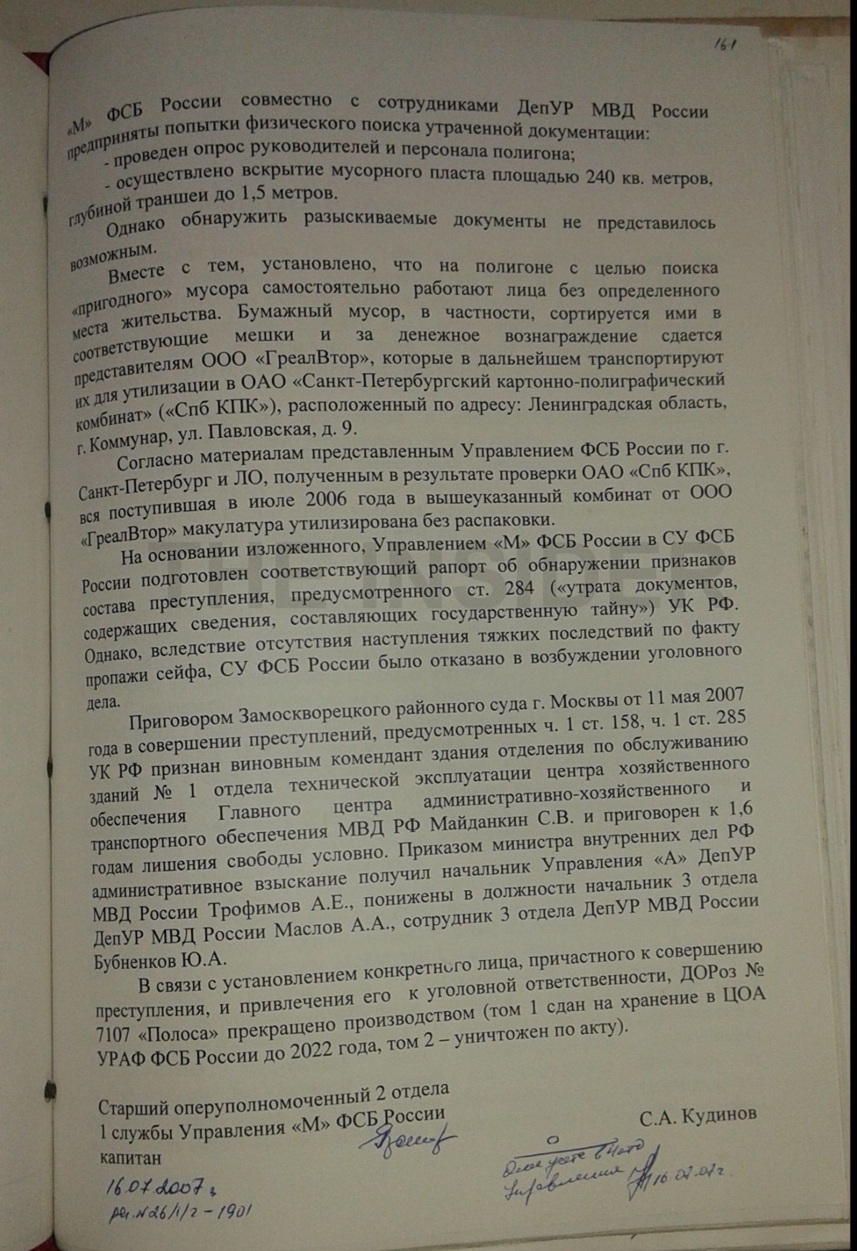 Что же касается пропавшего сейфа с секретными документами, то, как выяснило следствие, его вынесли бойцы в/ч 7456 внутренних войск МВД по указанию коменданта здания прапорщика Сергея Майданкина. Затем сейф погрузили на КамАЗ и сдали в металлолом. Приговором Замоскворецкого районного суда Майданкина осудили на 1,5 года условно.