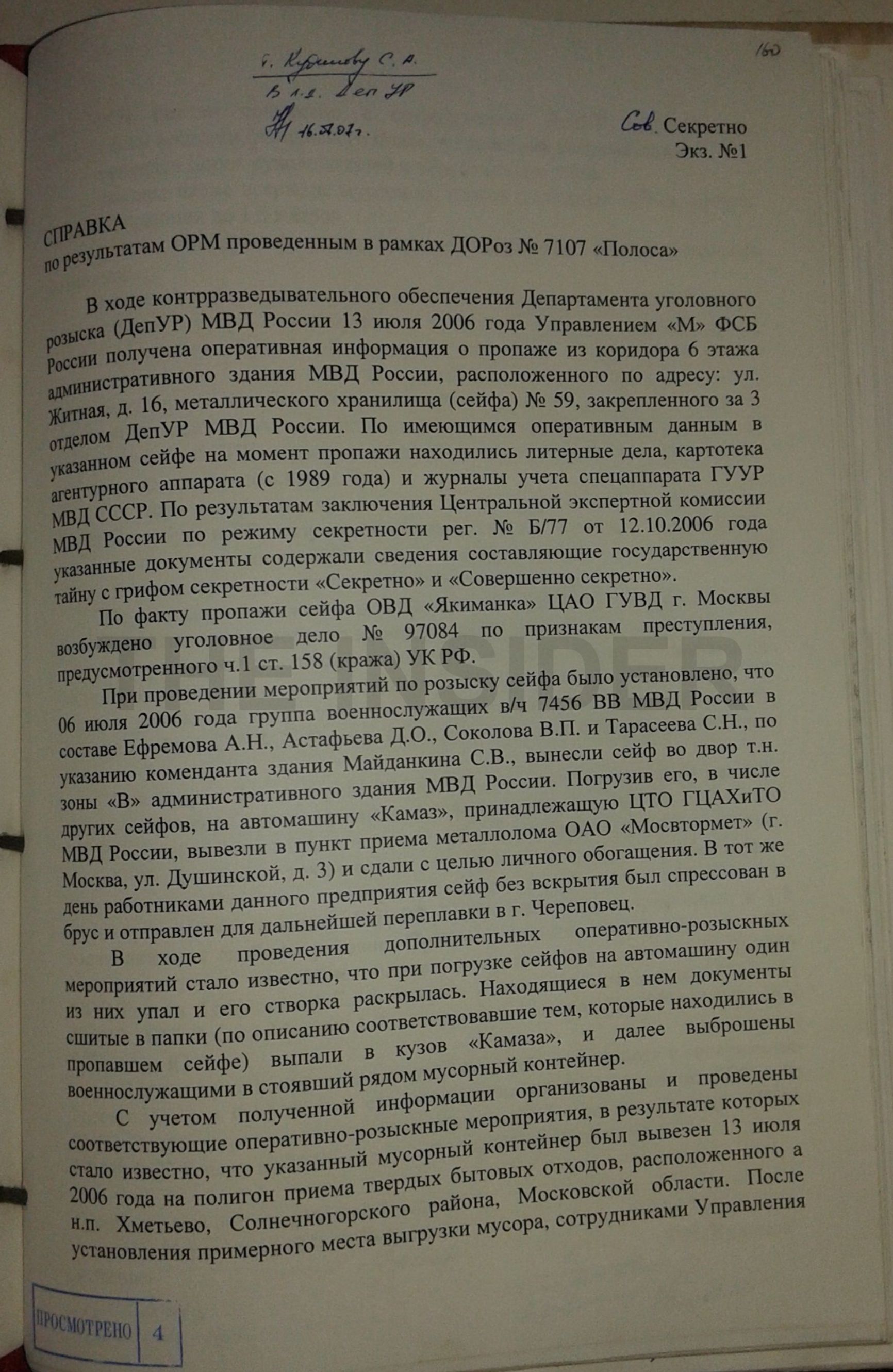 Между тем источники The Insider в МВД не верят в историю с металлоломом и считают кражу заказным делом. Эту версию подкрепляет то обстоятельство, что после убийства в Москве короля преступного мира Аслана Усояна (Деда Хасана) в его личном архиве оперативники обнаружили часть бумаг из сейфа № 59.