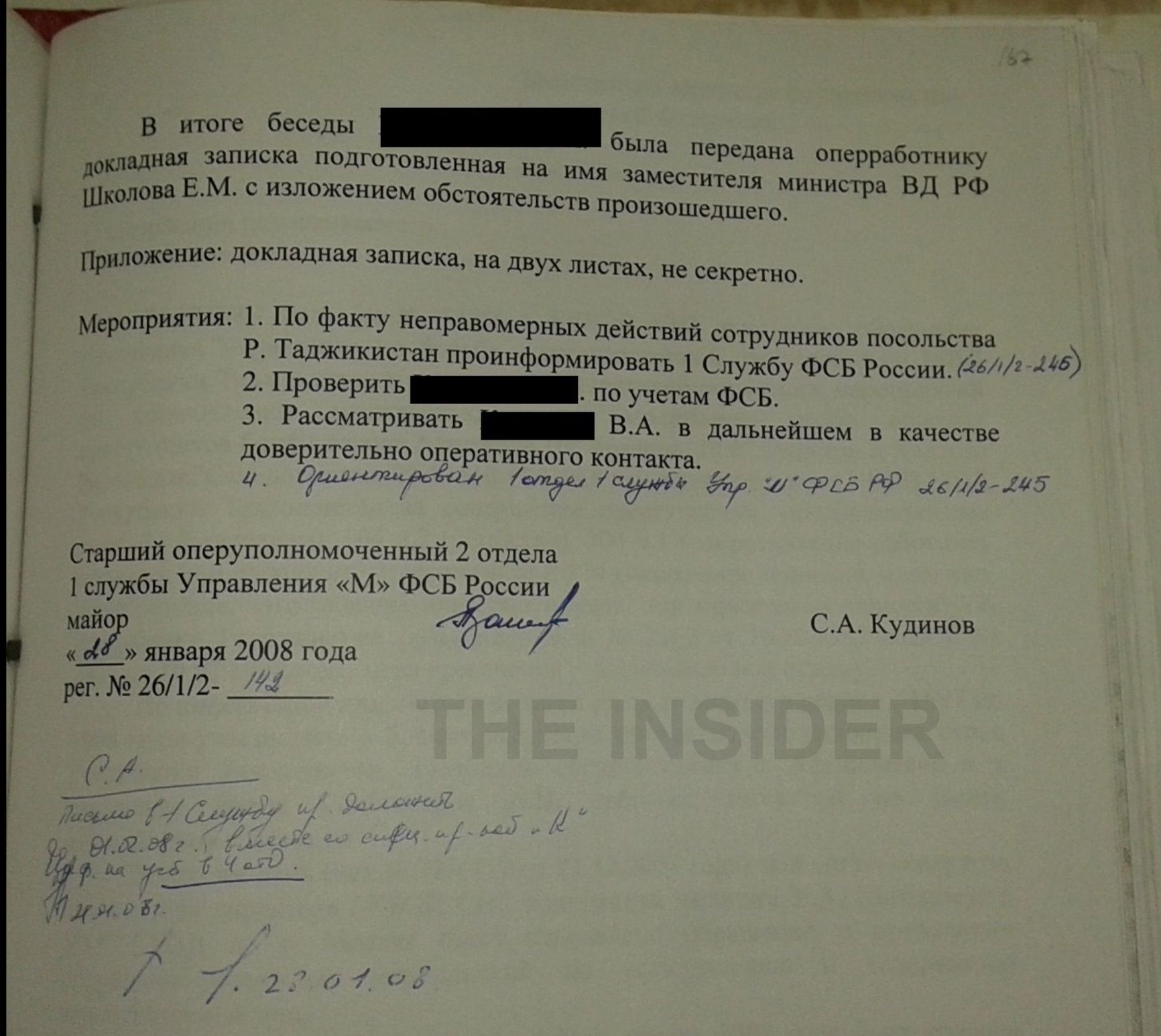 Тем временем руководство требовало от куратора ДепУР МВД майора Сергея Кудинова срочно предоставить результаты проверки, и тут, на его счастье, раздался стук в дверь. Визитером оказался сотрудник 12-го отдела ДепУРа подполковник К. Он не только сообщил обстоятельства незаконного задержания Гоибназарова и назвал фамилии оперативников, но и прихватил с собой подробный рапорт, адресованный заместителю главы МВД Евгению Школову (Школов, стоит отметить, служил вместе с Путиным в дрезденской резидентуре КГБ). Майор Кудинов по достоинству оценил инициативу подполковника К. и в своем отчете начальству попросил включить его в категорию «доверительно оперативный контакт» (ДОК).