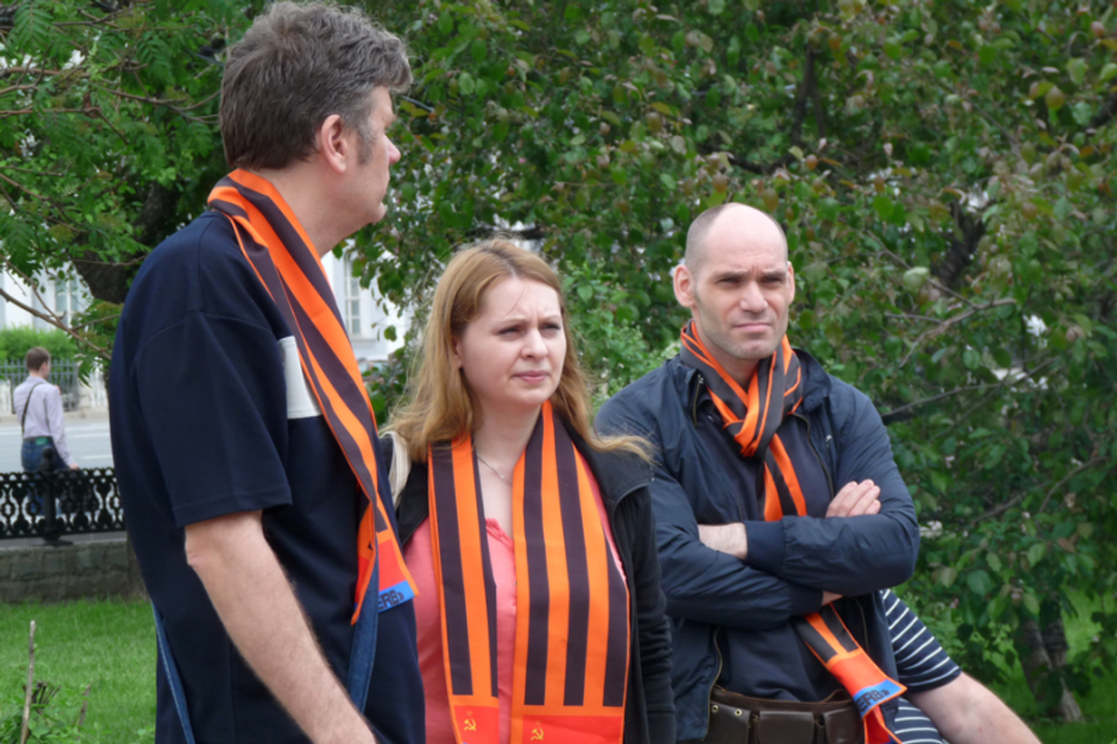 У SERB есть каналы коммуникации с полицией. Например, на уличной акции SERB, в которой я участвовал, присутствовал мужчина характерной оперской внешности. В отличие от остальных, он был без шарфа с символикой SERB (красный флаг с серпом и молотом и георгиевской лентой), но присутствовал именно как постоянный участник группы и ее акций. «Титушки» из SERB подтвердили мне – это действующий сотрудник МВД. Имя и должность его, впрочем, узнать не удалось (на фото ниже он в центре)